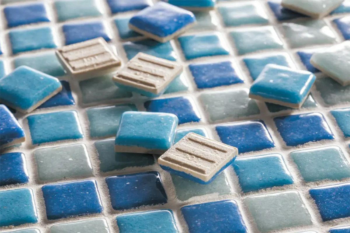 ガラスと磁器質タイルの二層構造で透明感や色の美しさと耐候性を両立させたモザイクタイルです。 さらに、裏足を設け表面の角を丸くすることで、施工面の安心感と施工後の安全性を確保しています。