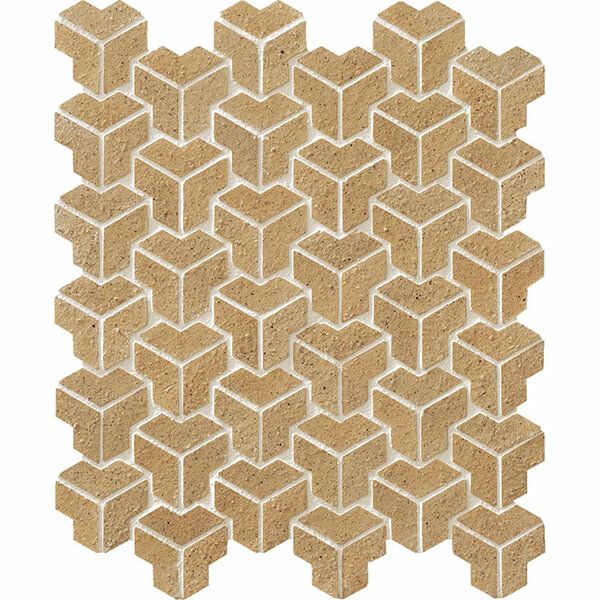 レンガイメージでさまざまな形状を揃えたモザイクタイル。ラフな面状に残った目地材が、より自然な雰囲気を演出します。