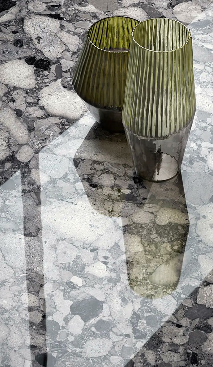 ヴェネチアンブレッチャストーン「角礫岩(かくれきがん)」に着想を得て、伝統的な石の優美さの中に現代的な斬新さを表現したシリーズです。平は、表面が乾いている時は滑らかでソフトな手触りですが、湿潤時には滑りにくくなる最新技術が施されているのが最大の特長です。