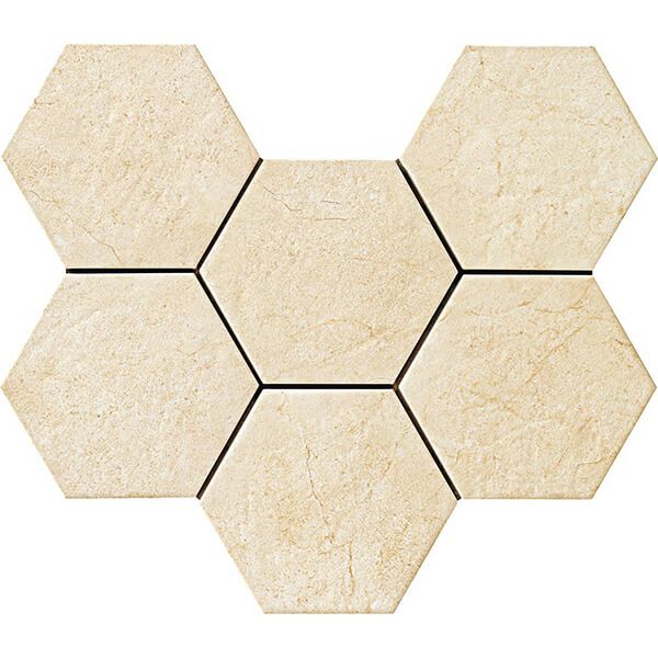 グラフィカルな模様と凹凸のある自然石風。本石では実現が難しい小さなボーダーや六角形などのモザイクが楽しめます。