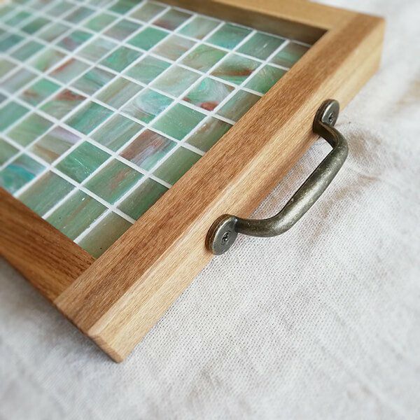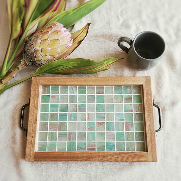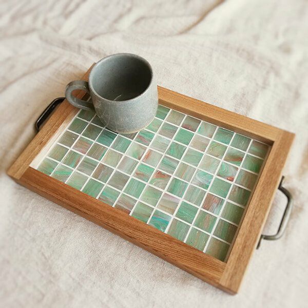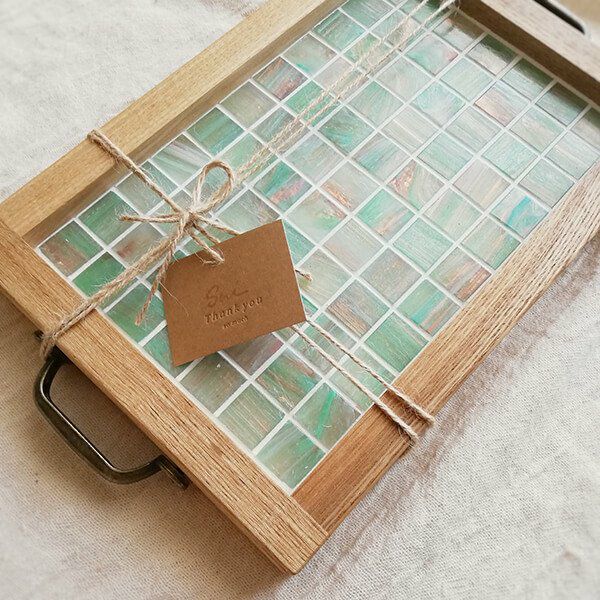 淡いグリーンと、オレンジ、白が混じり合うガラスタイル、シエルグラスのカフェトレイです。