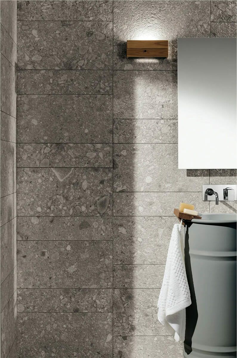 北イタリアで採掘される天然石、「Ceppo di Gr(チェッポ・ディ・グレ)」を再現した独創的なプロダクトで、現代的な要素として注目度の高いマテリアルです。 ノルディックモダンなテイスト、大胆な斑点がつくるランダム模様が、立体的な視覚効果を演出します。
