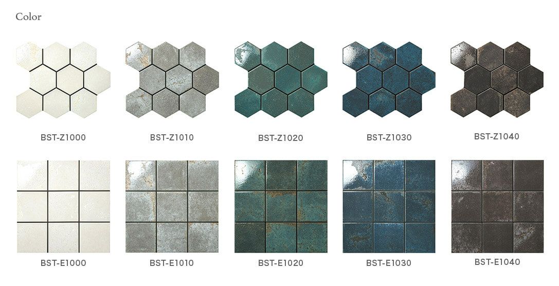 - ひび割れや染み等の意匠を施したものが含まれます。特に白(BST-E1000・Z1000)を白目地で施工した場合エイジング模様が目立ちやすくなります。