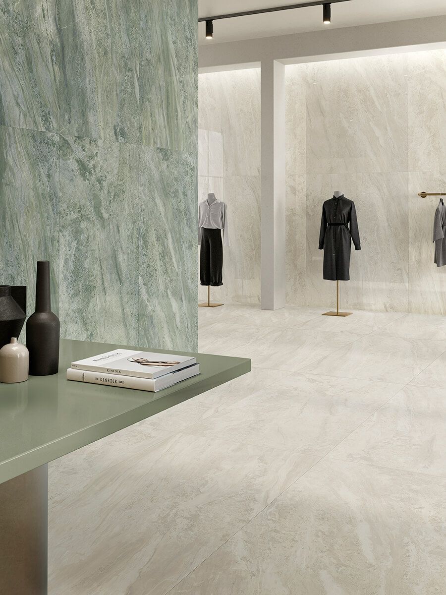 やわらかな色彩と詩的なグラフィックが空間に調和をもたらす、大理石調磁器質タイル「PARADISO」シリーズ。