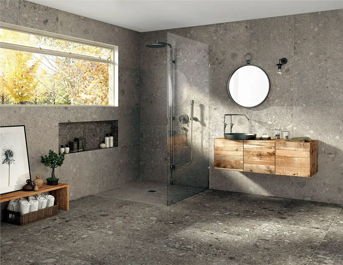 北イタリアで採掘される天然石、「Ceppo di Gr(チェッポ・ディ・グレ)」を再現した独創的なプロダクトで、現代的な要素として注目度の高いマテリアルです。 ノルディックモダンなテイスト、大胆な斑点がつくるランダム模様が、立体的な視覚効果を演出します。