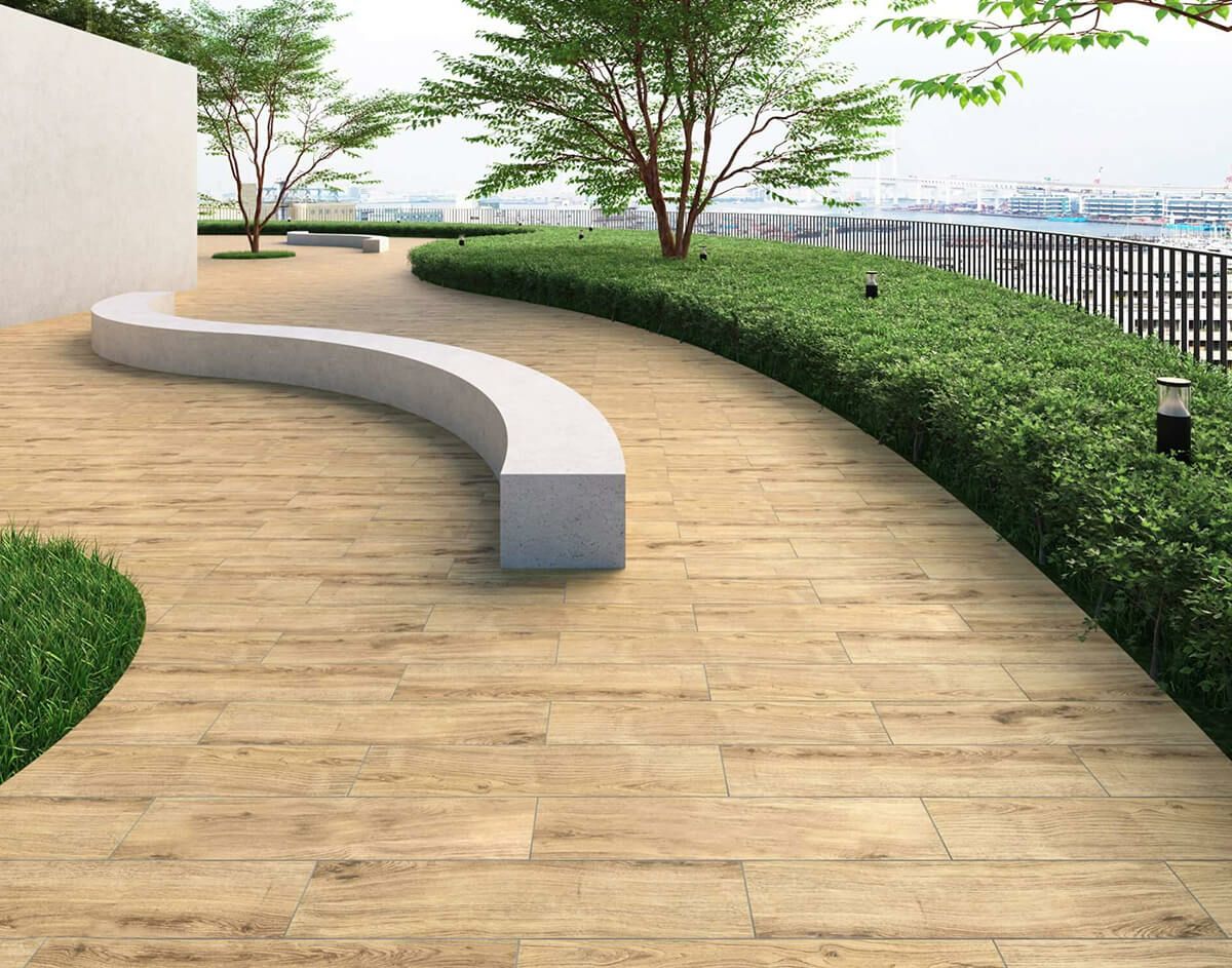 タイルの特性で劣化のない天然木柄の厚ものタイル。