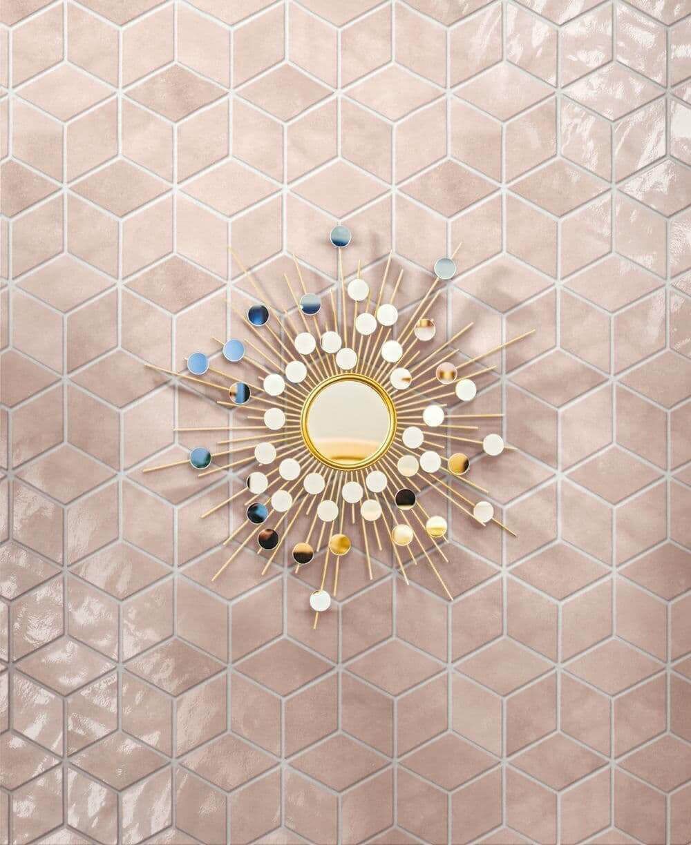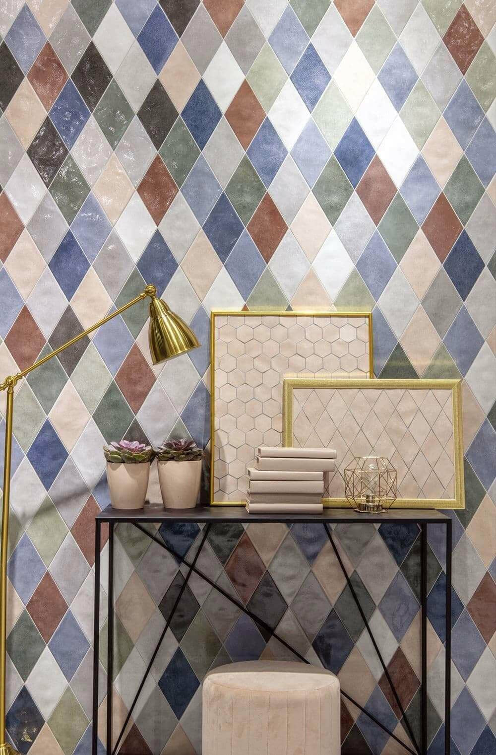 カタチとしての美しさが際立つダイヤ形状は、色とパターンの組み合わせでさまざまな幾何学模様に展開が可能。優しい光沢をもつ釉薬の表情とトーンを抑えたパステルカラーで、柔らかく包み込むような印象を創り出します。