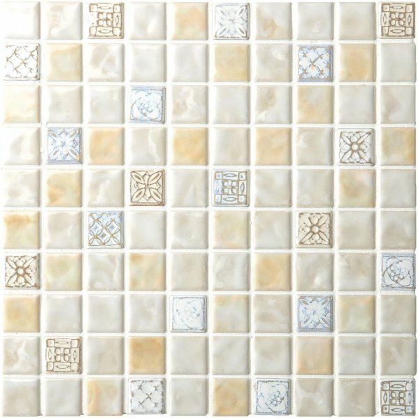 窯変釉と波打つテクスチュアが創り出す、ふんわりとした色彩の揺らぎ。クラシカルな彫刻柄をミックスしたモザイクタイルです。