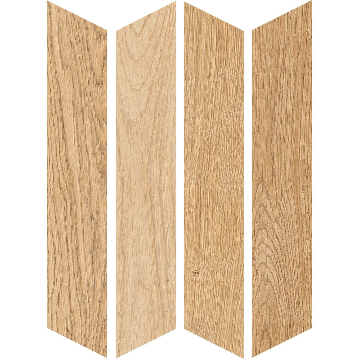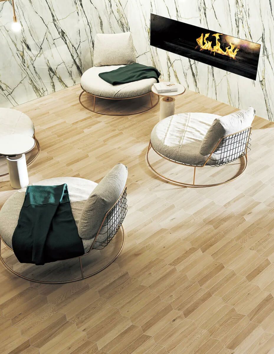 オーク材の美しさを追求し、滑らかな木目や小さな節を忠実に再現したシリーズです。平行四辺形の形状と組木細工のデザインはオリジナリティに溢れ、自然素材のあたたかさと、現代的でインダストリアルな雰囲気をバランス良く調和させています。