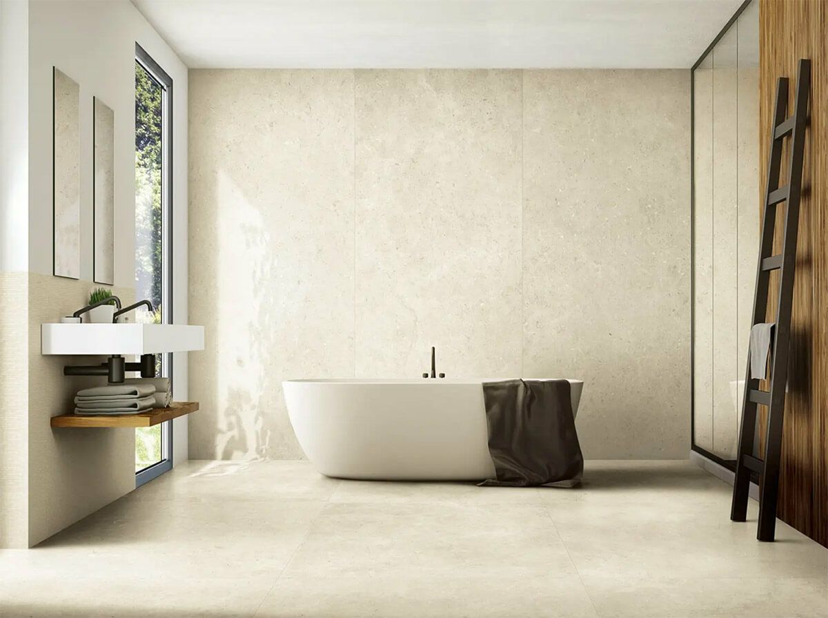1200×600角の10mm厚で3面状を揃えた大判サイズのシリーズです。 リッジ(隆線)のように立体感のある石模様の平面と、ハンマーで叩いたような岩面、柄はカネット(糸すじ)のような繊細なラインが特徴。 厳選した5種類の天然石の再現は、ミニマルで機能的な装飾とマッチします。
