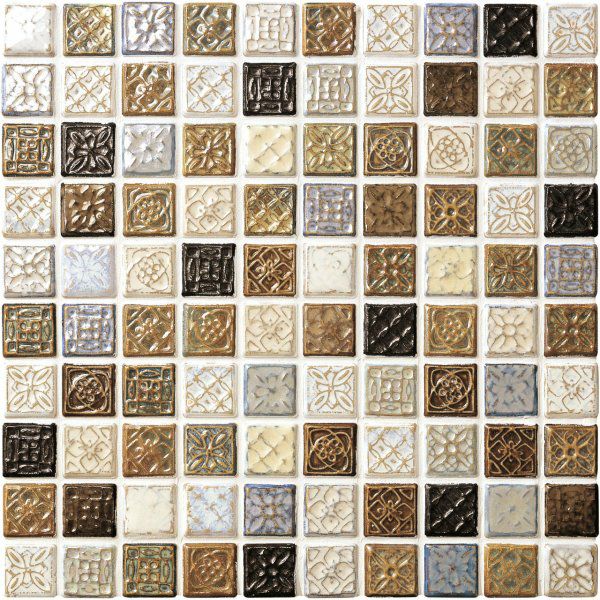窯変釉と波打つテクスチュアが創り出す、ふんわりとした色彩の揺らぎ。クラシカルな彫刻柄をミックスしたモザイクタイルです。