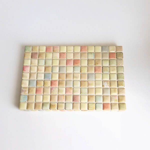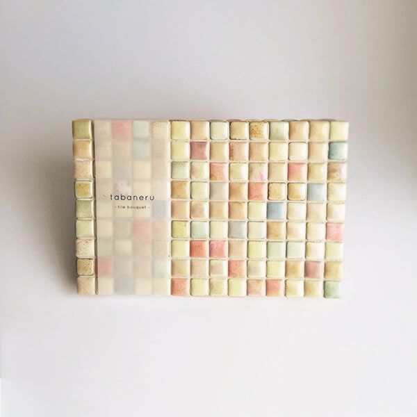 ふんわりとしたホワイト、淡いピンクやブルーをちりばめた優しいカラーのタイルディスプレイ。