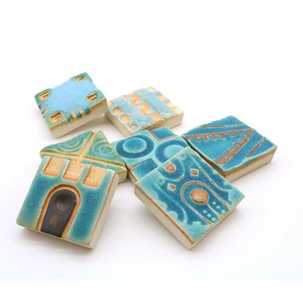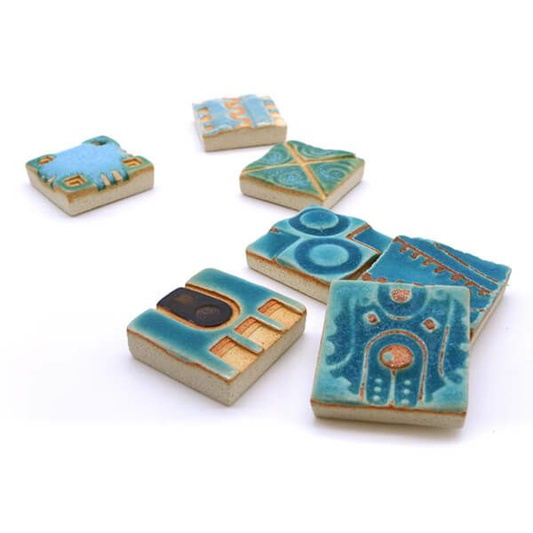 遺跡や街並みをモチーフとした作品を多く手がける彼女のタイルは、宝箱に大切にしまっておきたくなるような、どこかエキゾチックな佇まい。タイルとしてはもちろん、箸置きやアクセサリーパーツとしての使用もおすすめです。