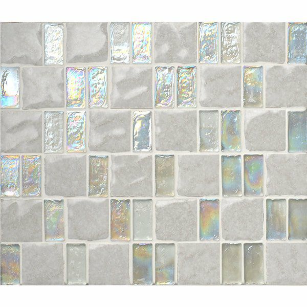 長方形のガラスタイルと正方形のセラミックタイルをミックス張りした、異素材の煌びやかやかなコントラストが美しいモザイクタイルです。タイルクラフトやDIYにも使いやすい42×42角・42×20角サイズ。