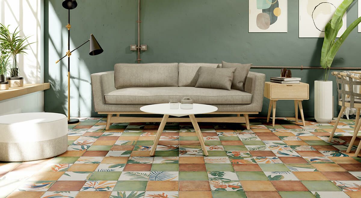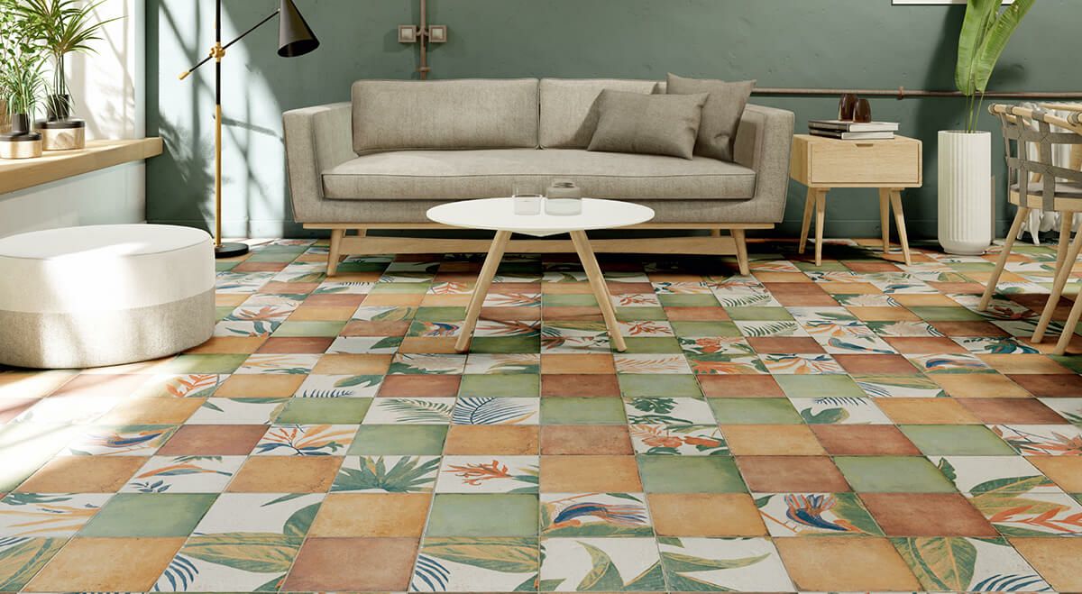 ラフなエッジとボタニカルデザインがアジアンリゾートのテイストを演出します。抵抗評価(DIN51130)R10で滑りにくいため、屋外フロアへの使用も安心です。