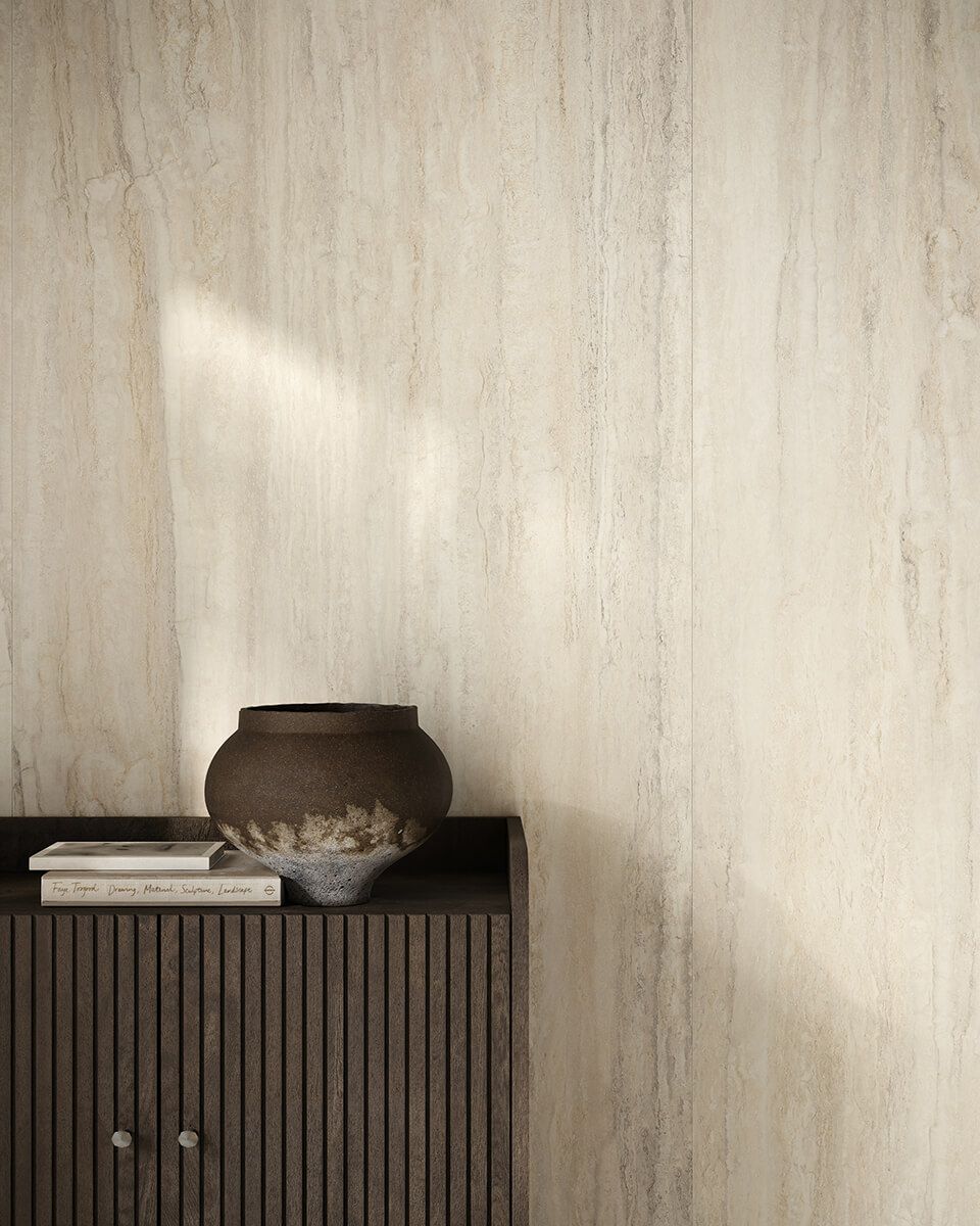 インヴィクタス クロスは、トラバーチンの多様性を完成させるもので、このコレクションでは、天然素材としてのトラバーチンが縦目と横目の両方の模様で見られます。