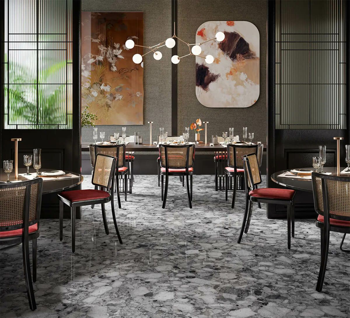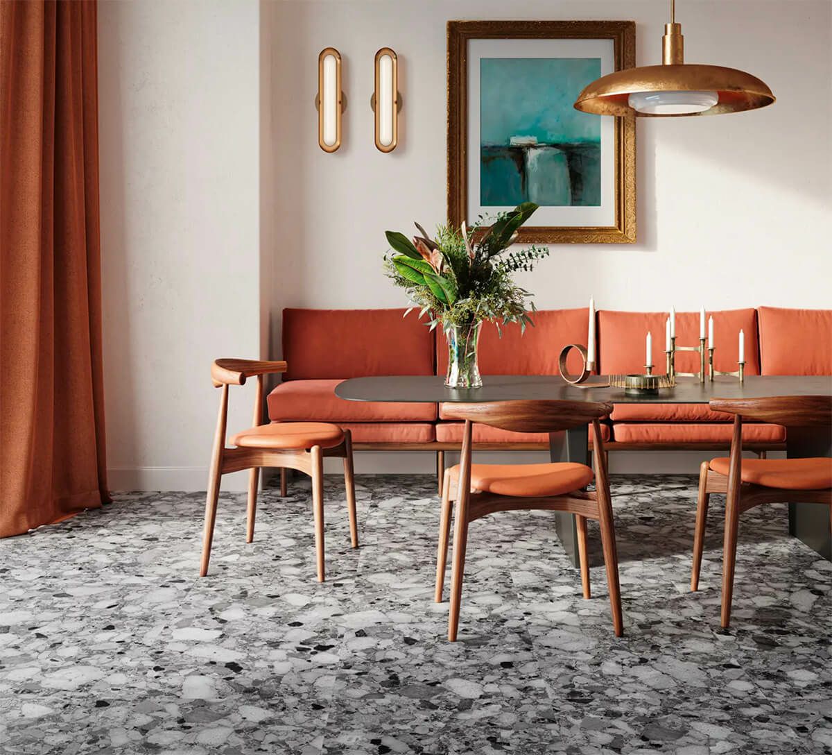 ヴェネチアンブレッチャストーン「角礫岩(かくれきがん)」に着想を得て、伝統的な石の優美さの中に現代的な斬新さを表現したシリーズです。平は、表面が乾いている時は滑らかでソフトな手触りですが、湿潤時には滑りにくくなる最新技術が施されているのが最大の特長です。