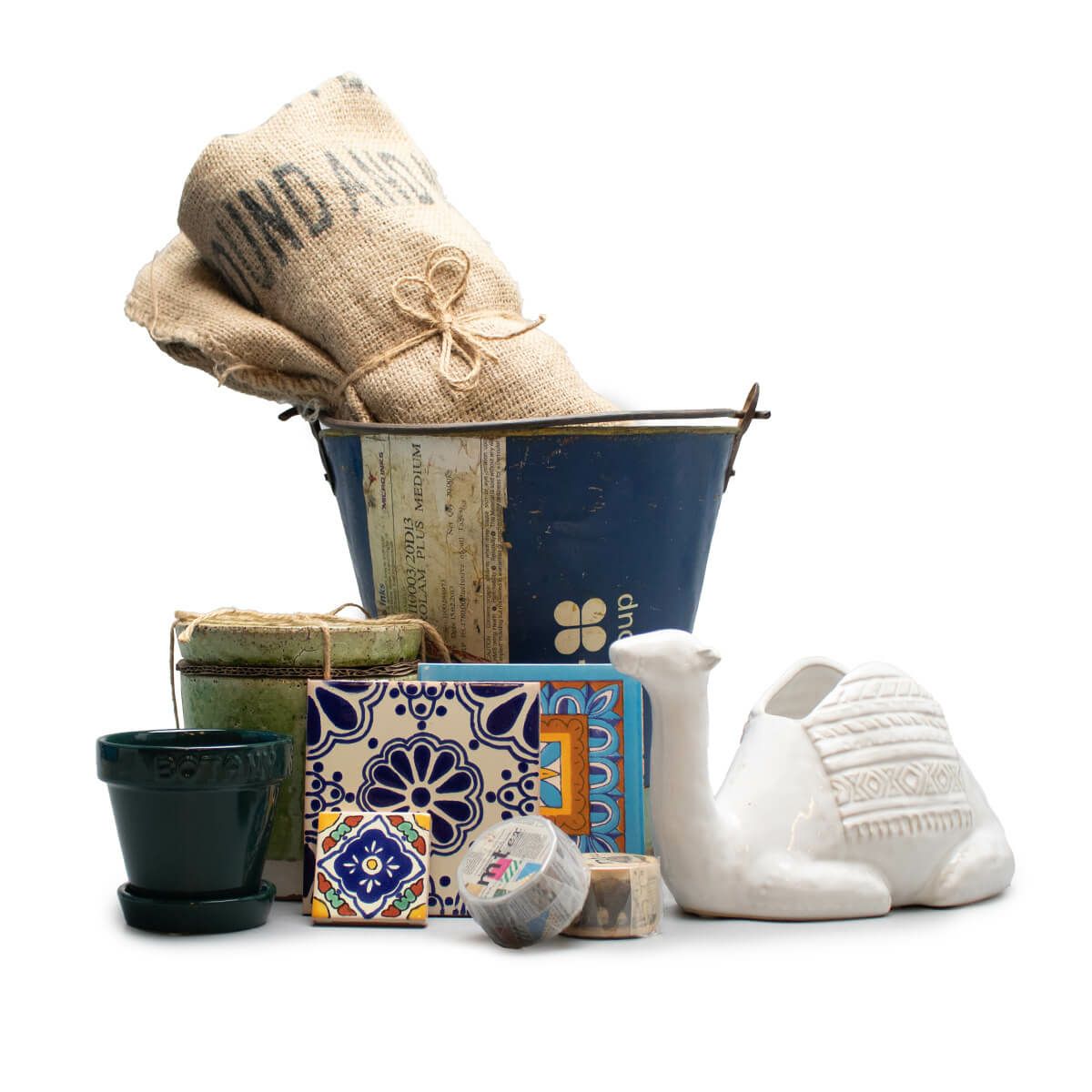 ユニークな「ラクダ型」の植木鉢に、アンティークなバケツ、使い方自由自在な麻袋。ガーデニングが楽しくなるグッズに、ボウクス タイルマーケットで人気のメキシコタイルをプラスした福袋です。