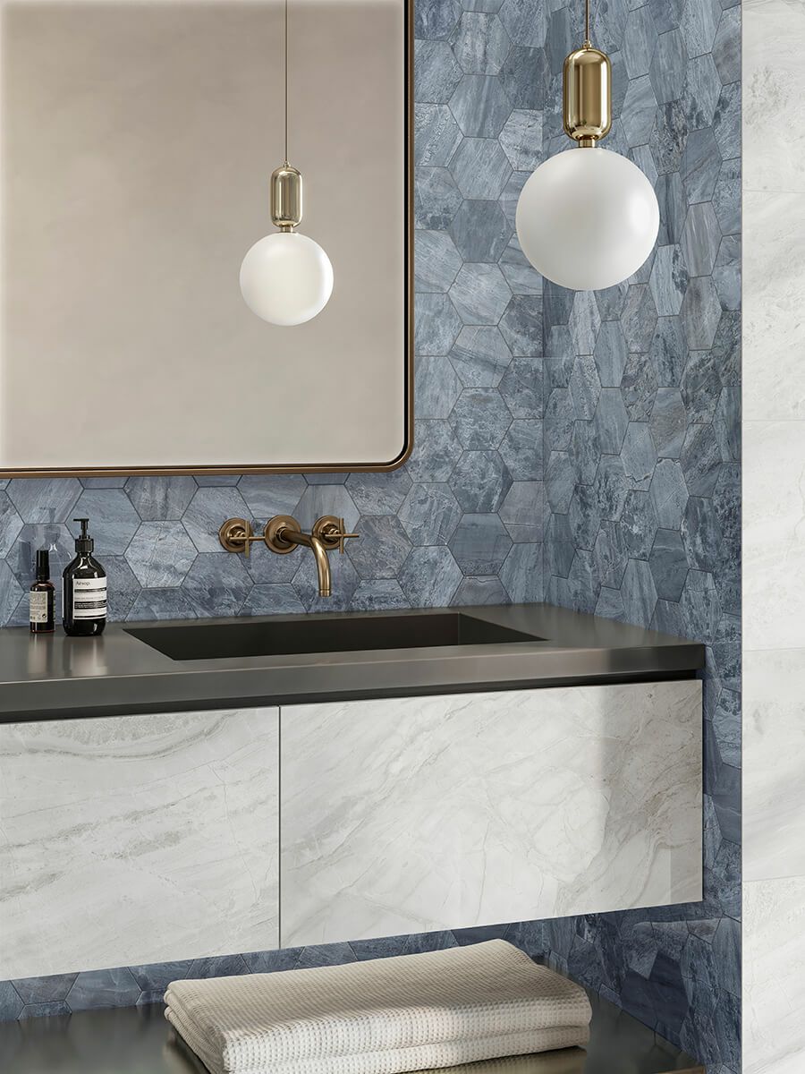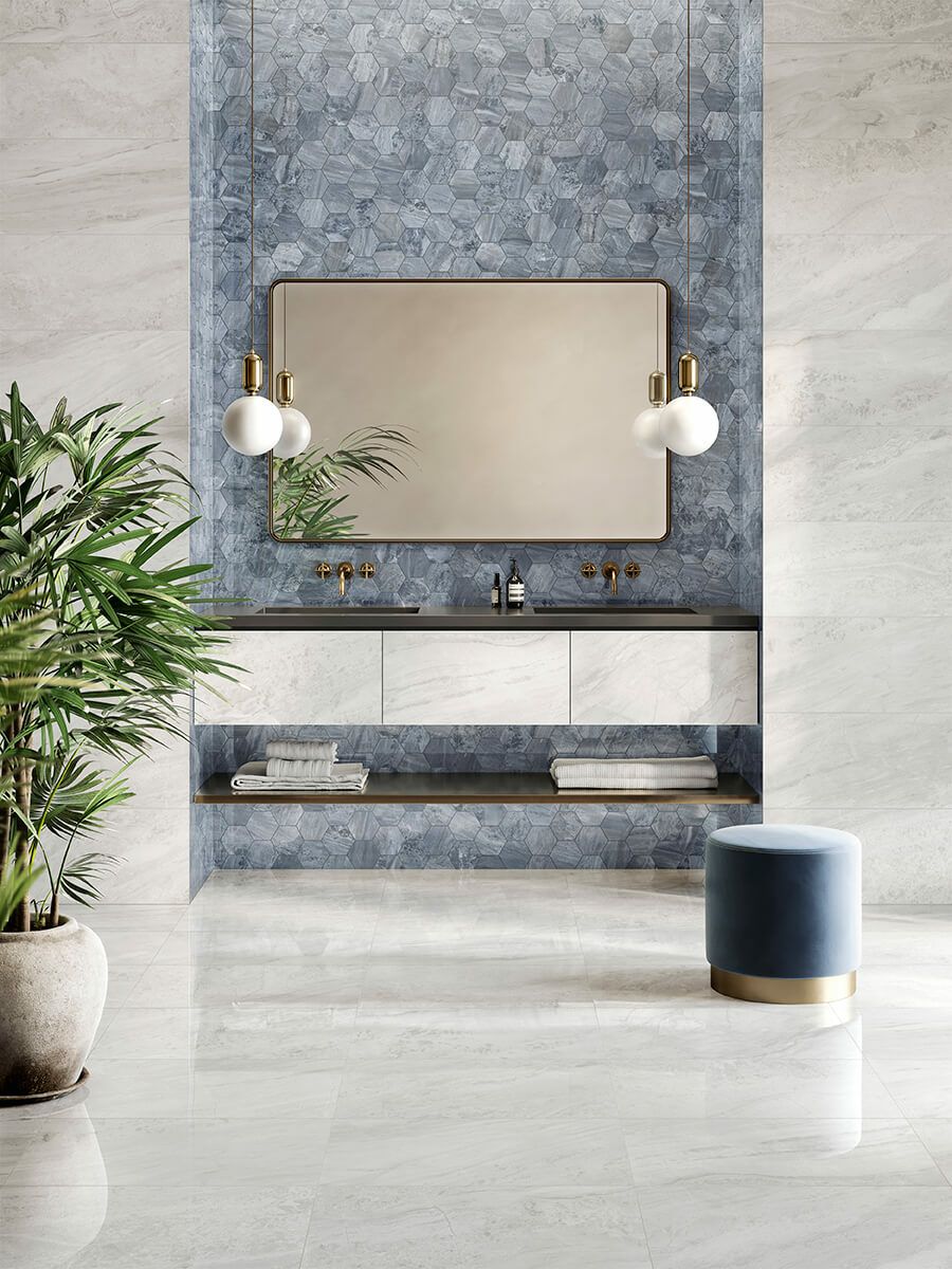 やわらかな色彩と詩的なグラフィックが空間に調和をもたらす、大理石調磁器質タイル「PARADISO」シリーズ。