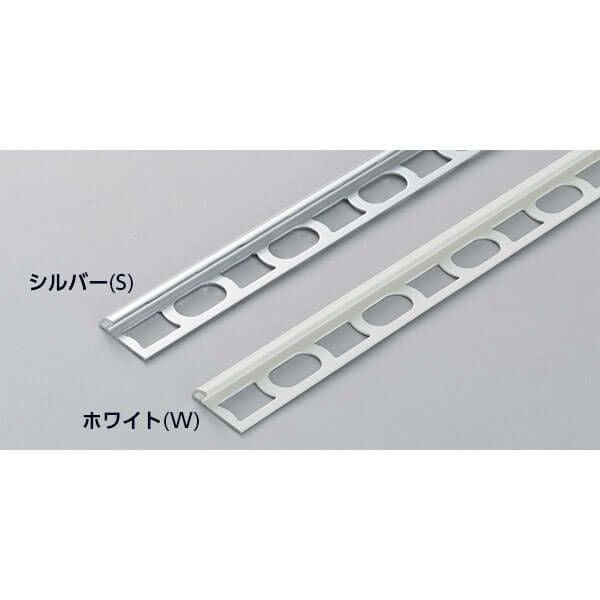 - 色番のSはシルバー、PGはゴールド、Wはホワイト、MBはブラックを、また壁見切りJ,C,R,Lの数字6〜13は適合タイル厚さを、壁見切りUの数字の15、25は見切り材の幅を示しています。