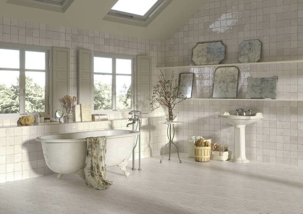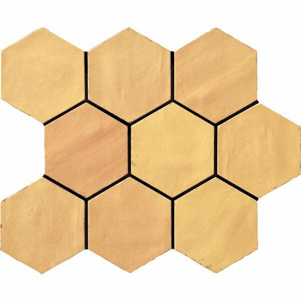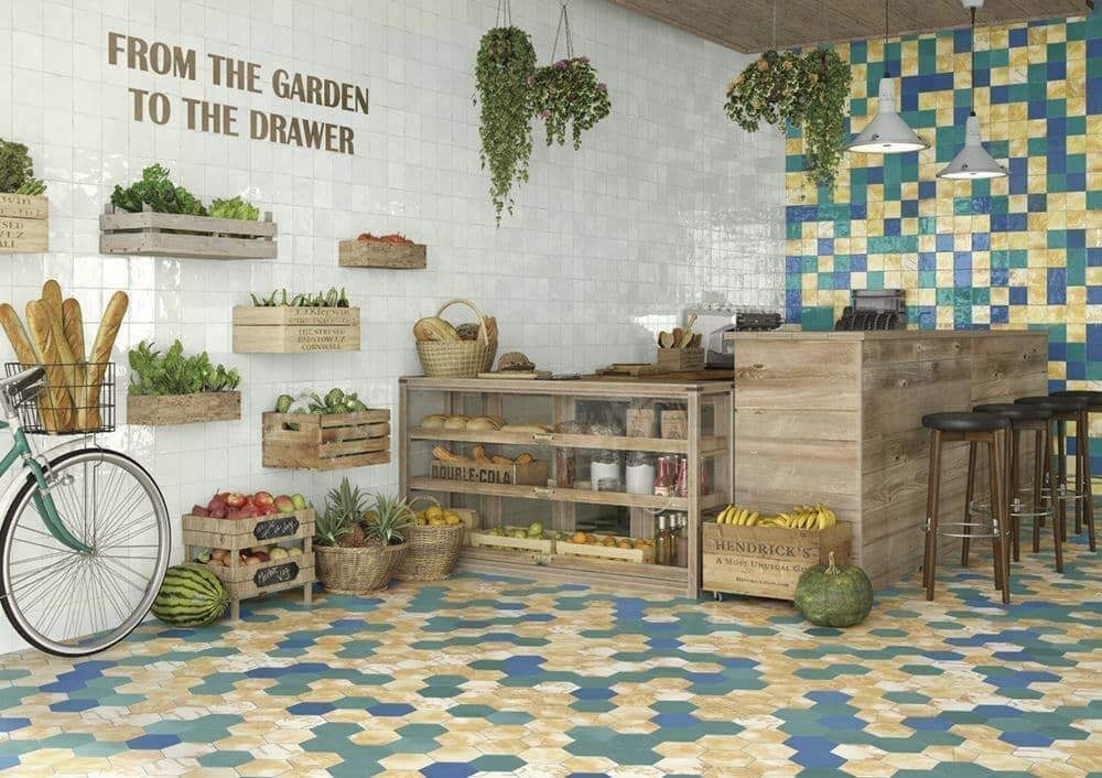 モロッコの伝統的なゼリージュ・タイルをモチーフに、流行のボタニカル柄と六角形を加えて現代的な使い方をしています。