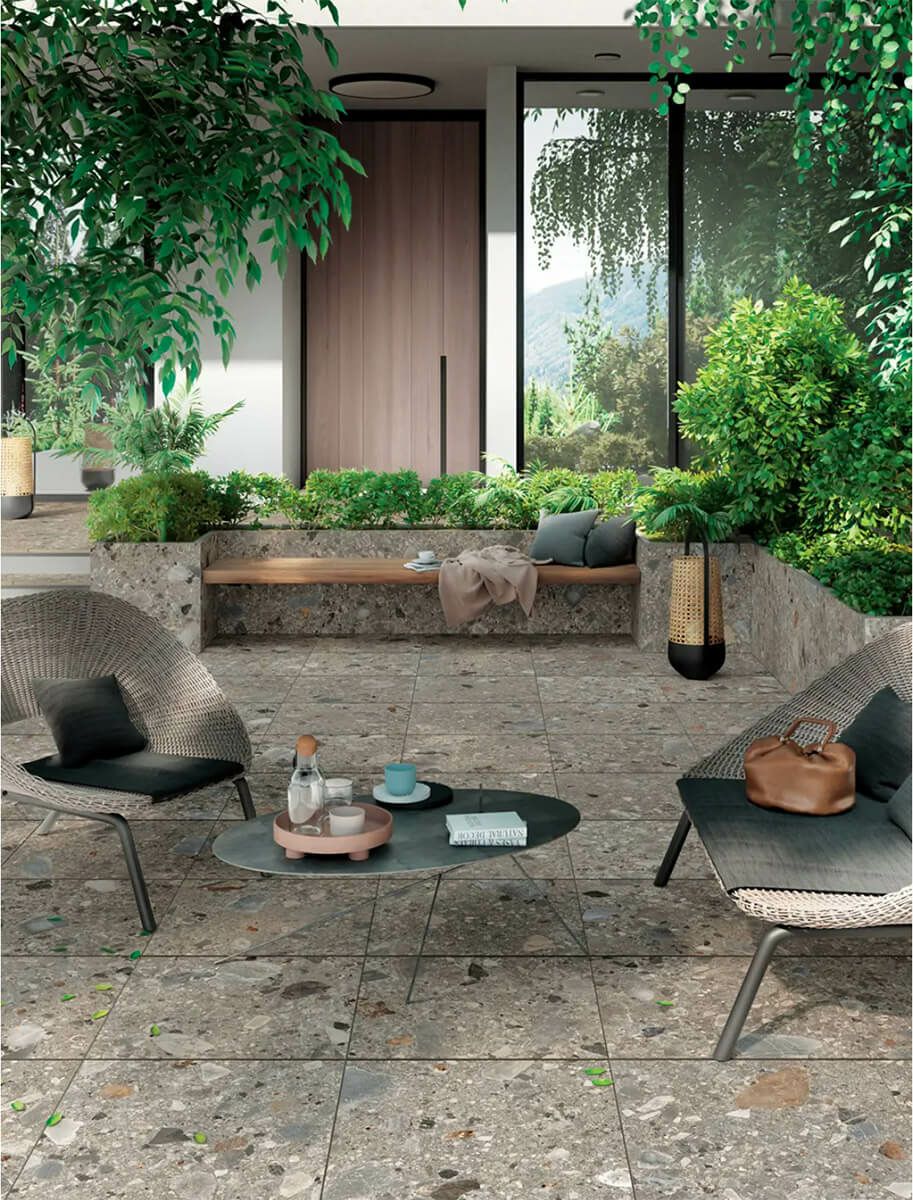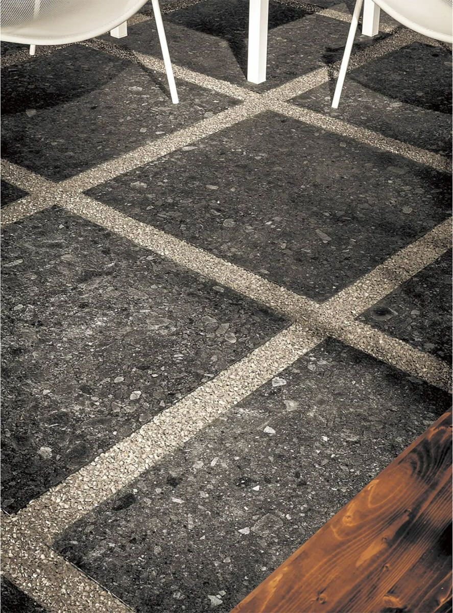 厚さ20mmのタイルは、水まわり、プールサイド、テラス、庭園など、屋外の舗装とインテリアスタイルをコーディネイトできるよう意匠設計されています。 敷き詰めるだけでなく、飛び石のような使い方もお勧めです。
