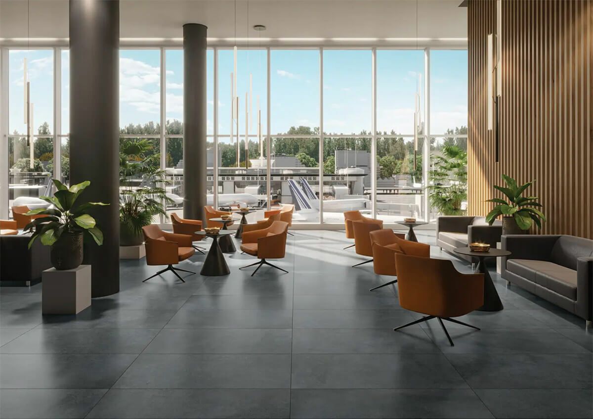 少し日に焼けて味わいがでてきたコンクリートの表情に柔らかな色調を加えることで、優雅で爽やかな雰囲気に仕上げています。 ツヤのある平面と表面を磨いた部分磨きの2面状と、外床向けには高強度の20mm厚をご用意しています。