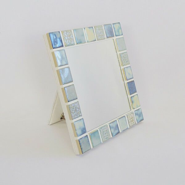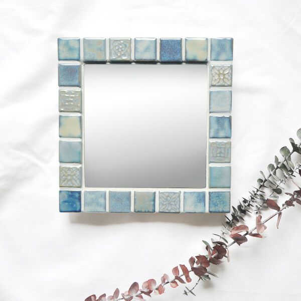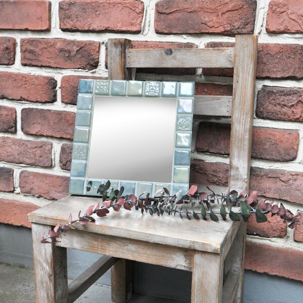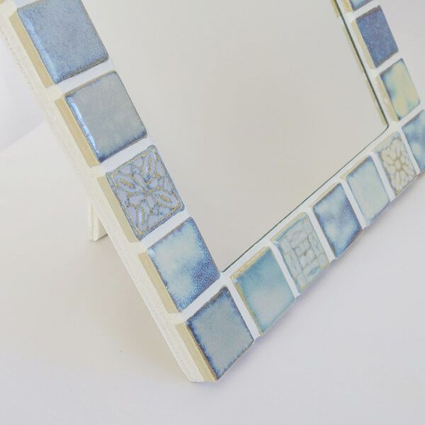 窯変釉と波打つテクスチュアが創り出す、ふんわりとした色彩の揺らぎ。クラシカルな彫刻柄をミックスしたモザイクタイル「ルーメン」を使った置き型のミラーです。