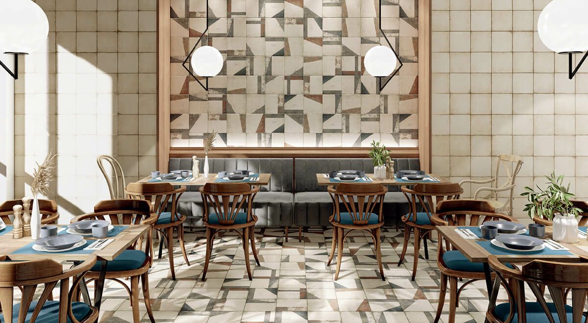 ラフなエッジとボタニカルデザインがアジアンリゾートのテイストを演出します。抵抗評価(DIN51130)R10で滑りにくいため、屋外フロアへの使用も安心です。