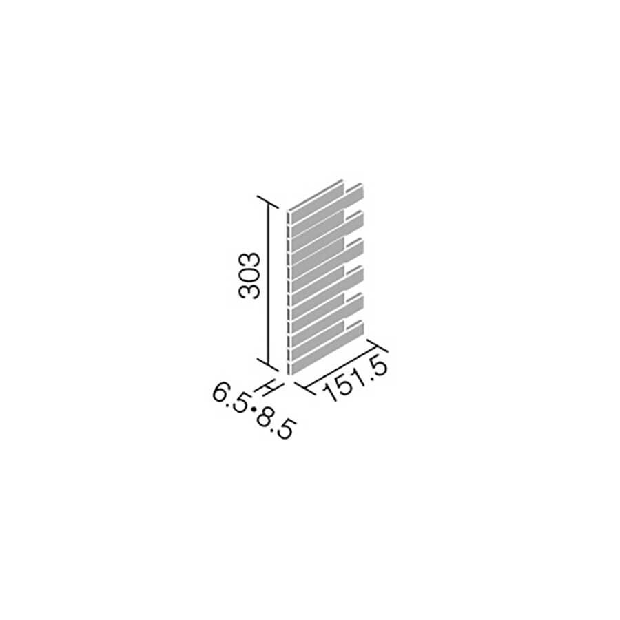 - 25×151角ネット張り(入隅用)は、入隅部分に同一厚さの粒をそろえることで、入隅の凹凸を軽減する役物ですが、意匠がついているため完全にフラットにはなりません。