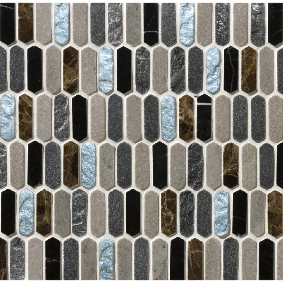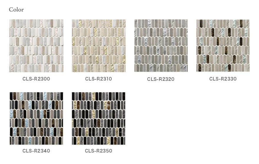 長細い六角形が特徴。宝石のような輝きを持つ樹脂と、天然の石材を組み合わせた品のある表情豊かなモザイクタイルです。