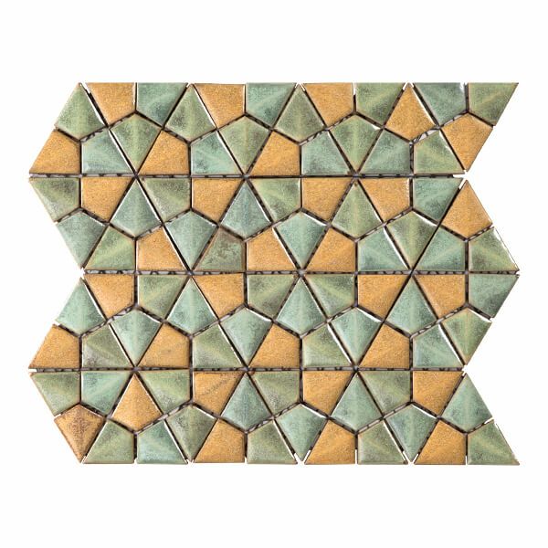 日本の伝統模様から派生した形に艷やかな釉を施した亀甲形のタイル。ランダムな花紋様が気品ある空間を創作します。